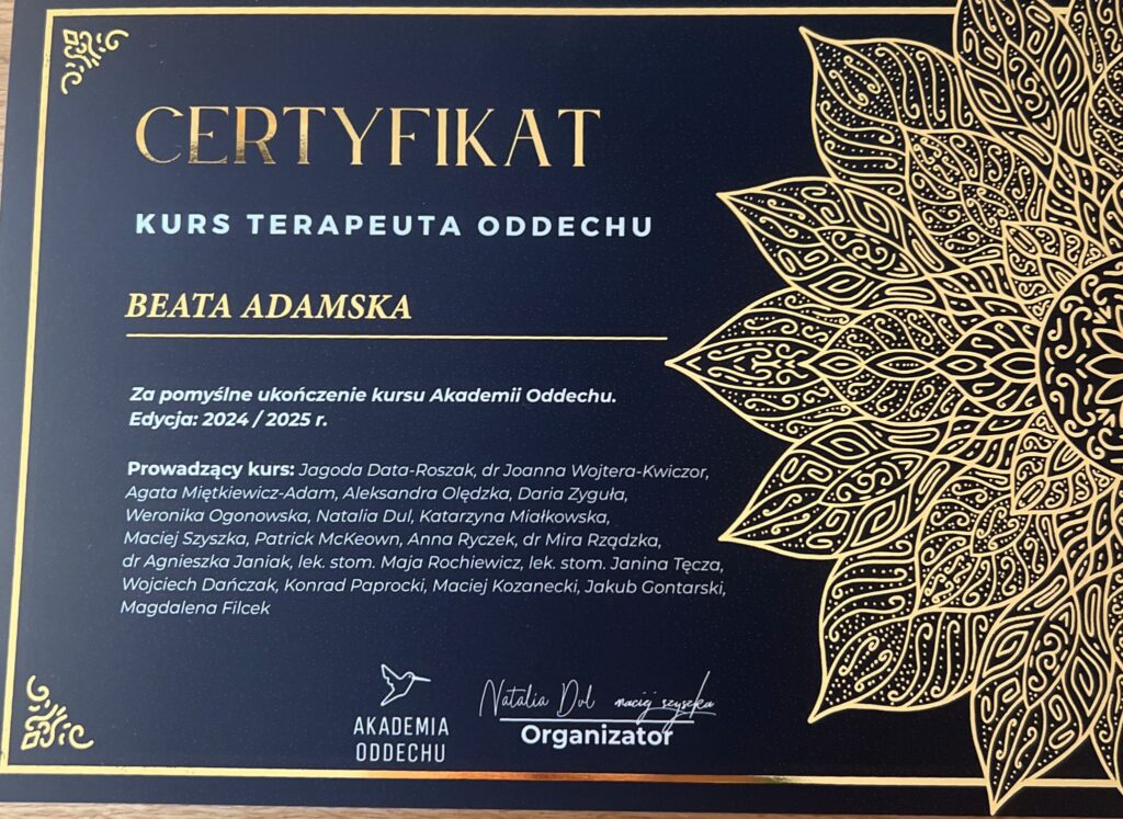 Kurs terapeuty oddechu nie tylko podniósł moje kwalifikacje zawodowe, ale przede wszystkim otworzył przede mną nową perspektywę na oddech – jako coś znacznie więcej niż tylko fizjologiczny proces. Zrozumiałam, że oddech to lustro naszej wewnętrznej kondycji – emocjonalnej, psychicznej, a nawet duchowej.